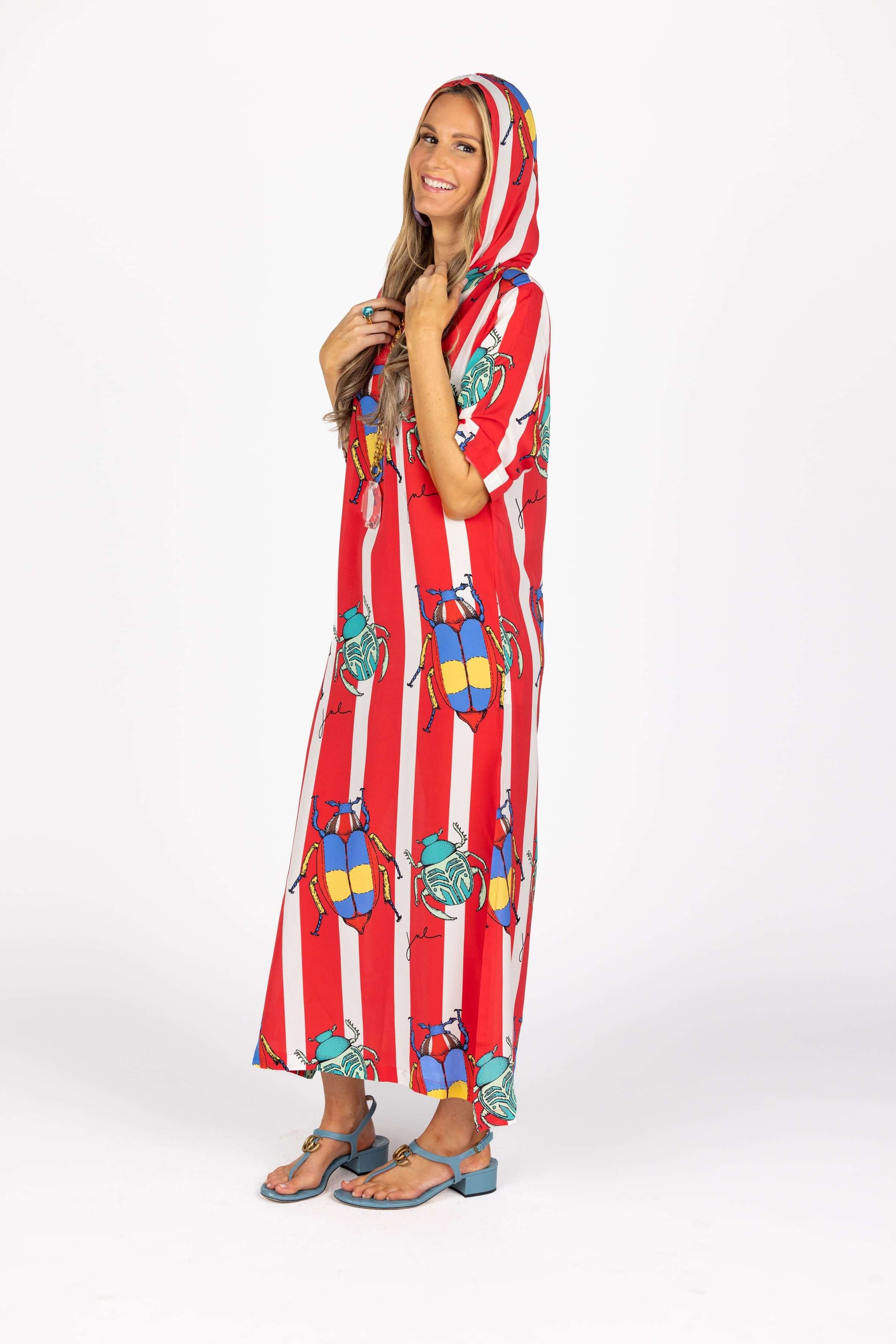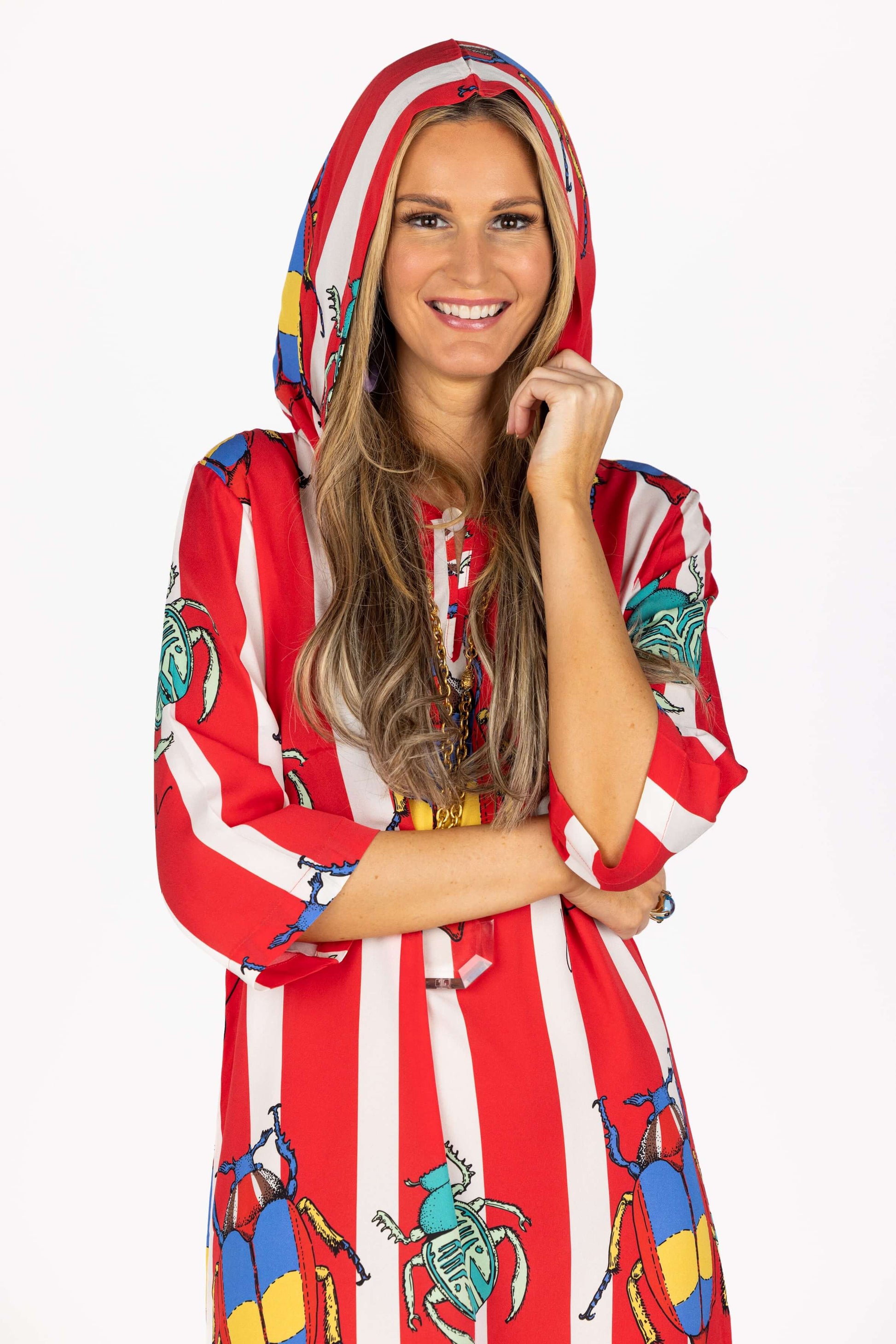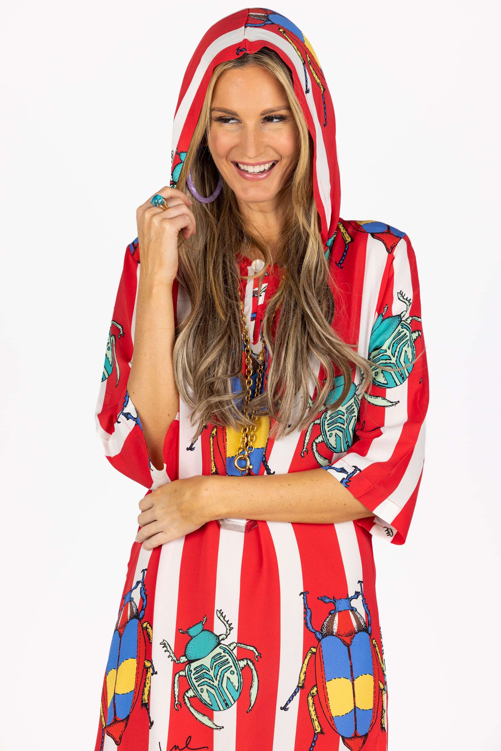 A great silk coverup for the pool or the beach. Made out of 100% Georgette Silk in the JR original print Beetle Bug Red. Side slits at both legs. Slips right over your head. 3/4 quarter sleeves. Wear open or button at the neckline. A hood adds a chic accent.