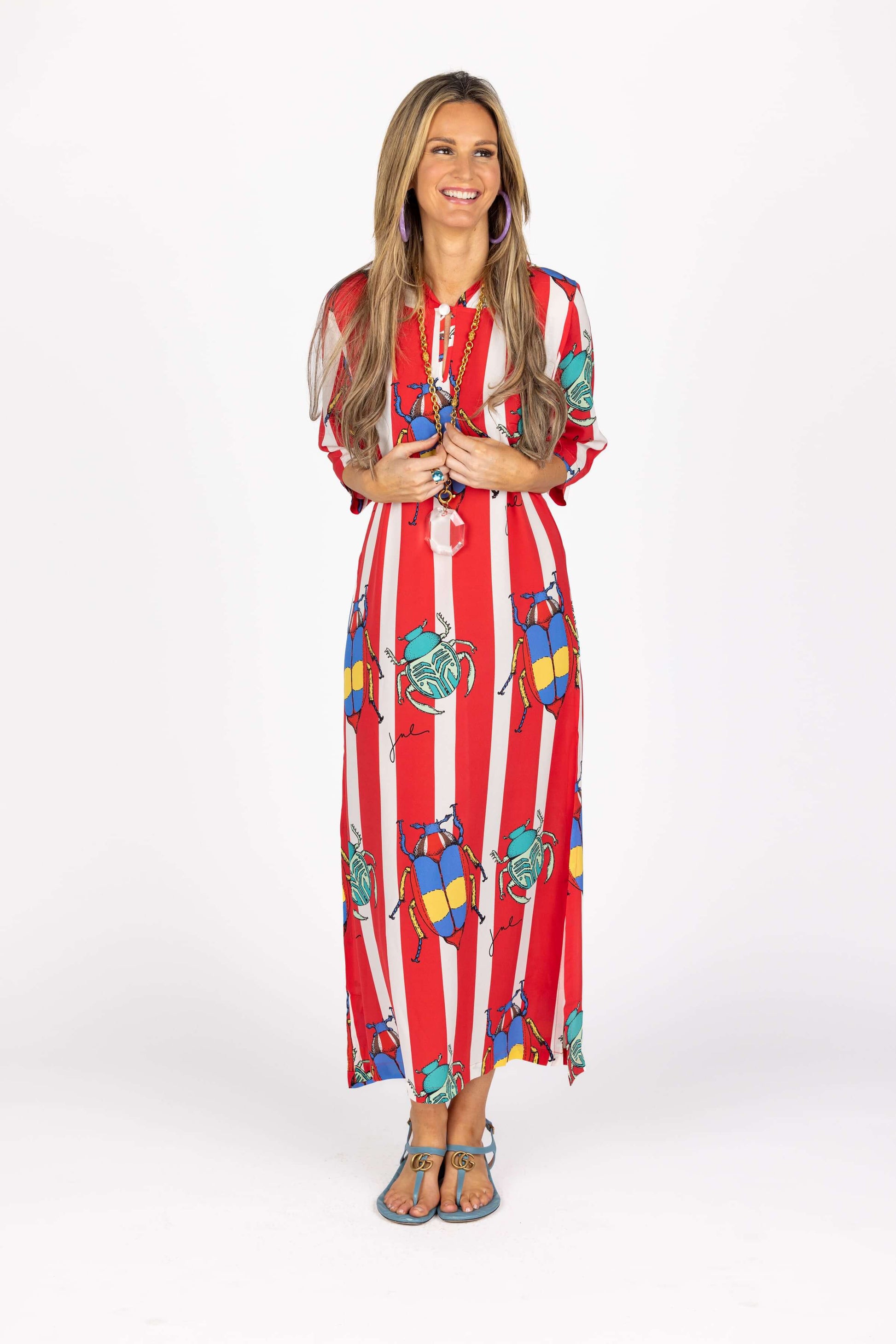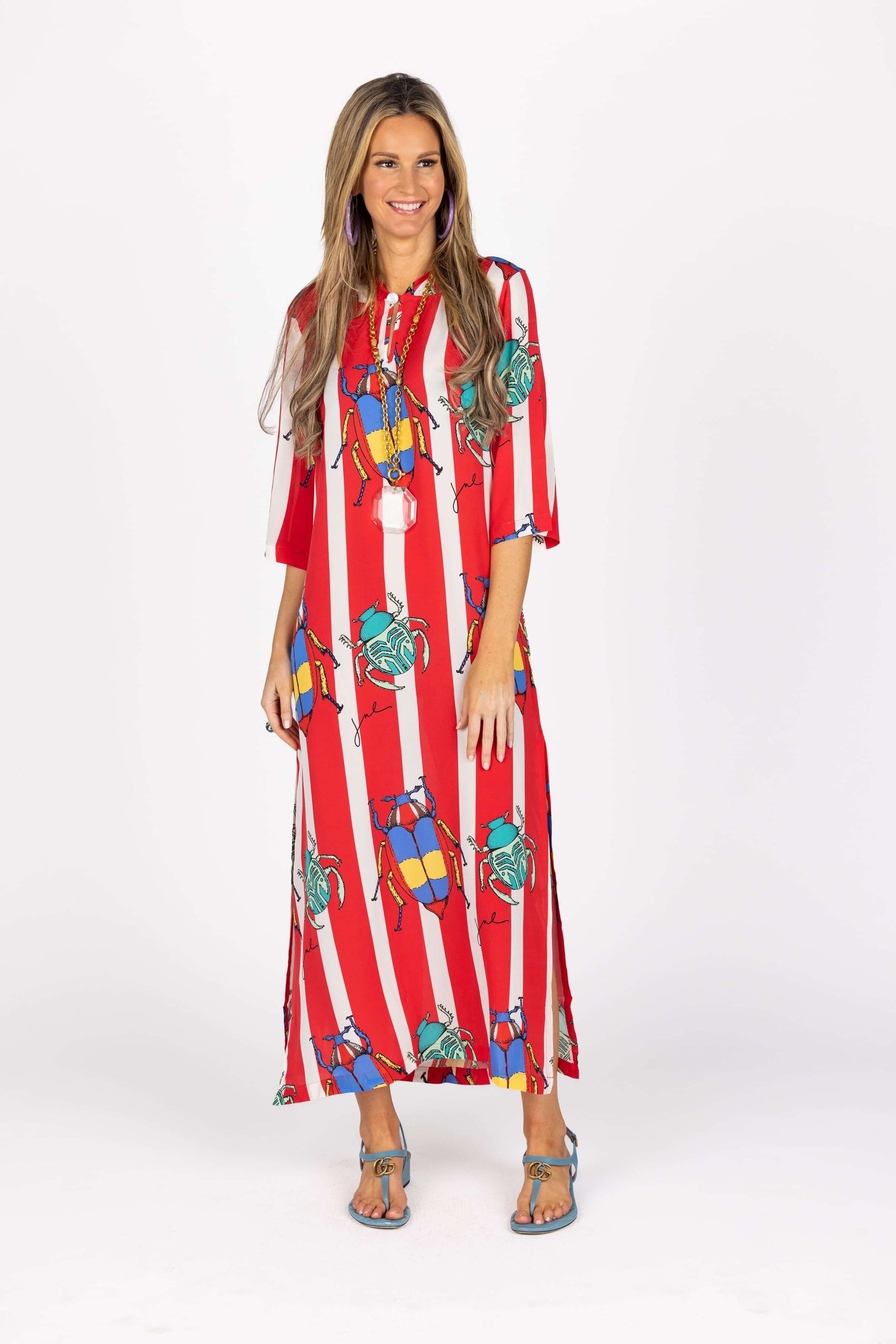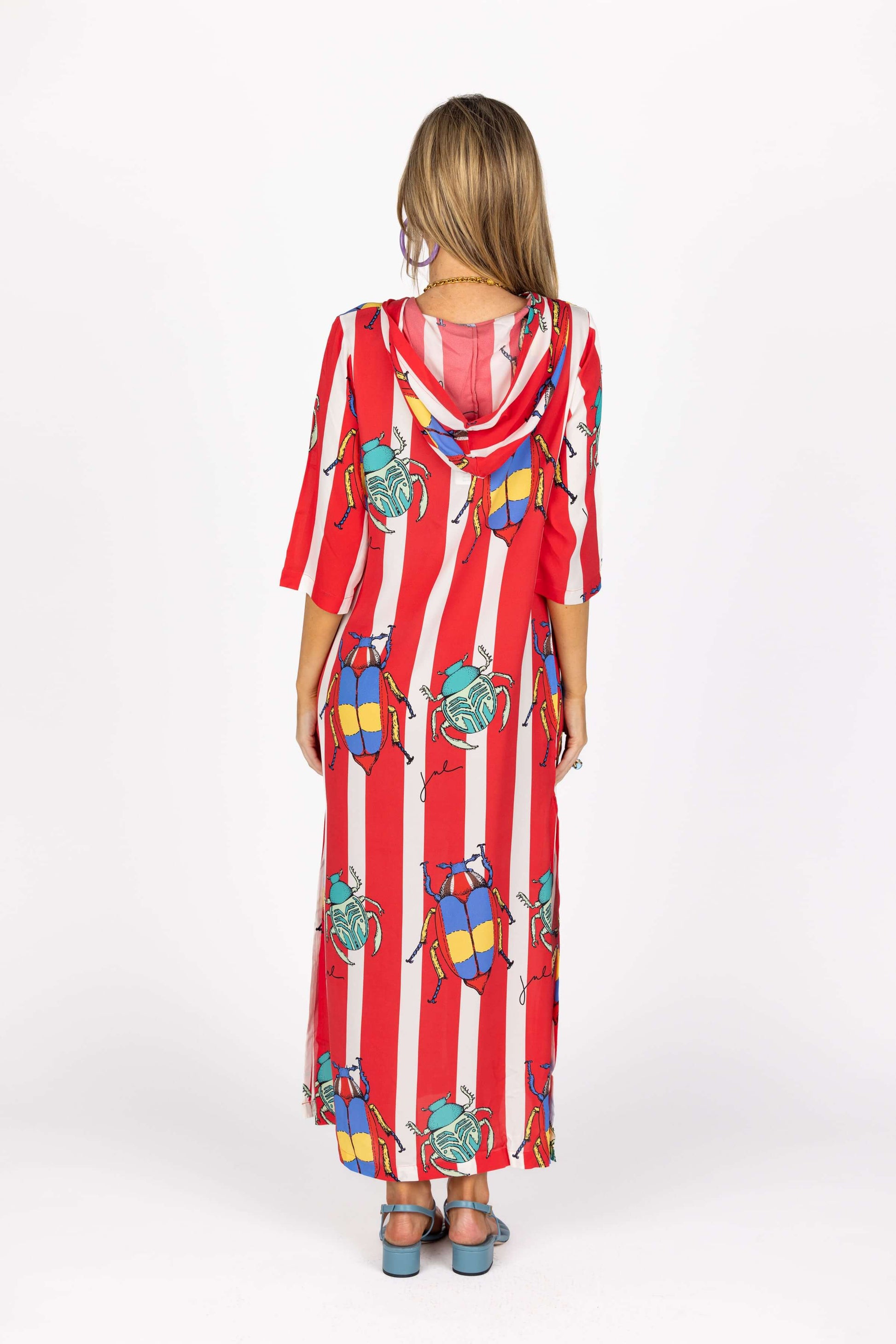 A great silk coverup for the pool or the beach. Made out of 100% Georgette Silk in the JR original print Beetle Bug Red. Side slits at both legs. Slips right over your head. 3/4 quarter sleeves. Wear open or button at the neckline. A hood adds a chic accent.