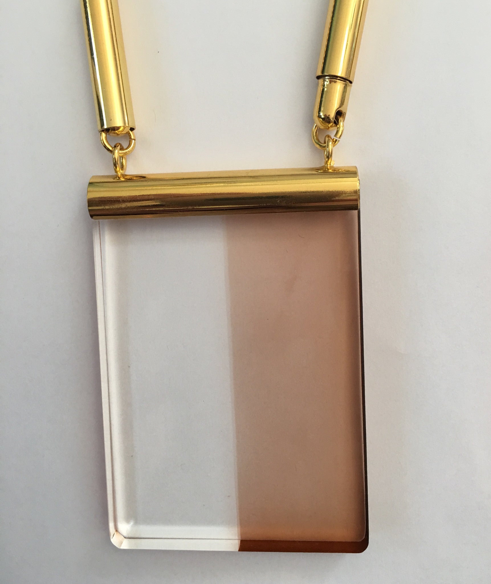 A lucite pendant on a gold snake round chain. Brown. Orange. Pink or Lavender. A LANVIN look alike !!!! Wear it double with a Buddha Tassel !