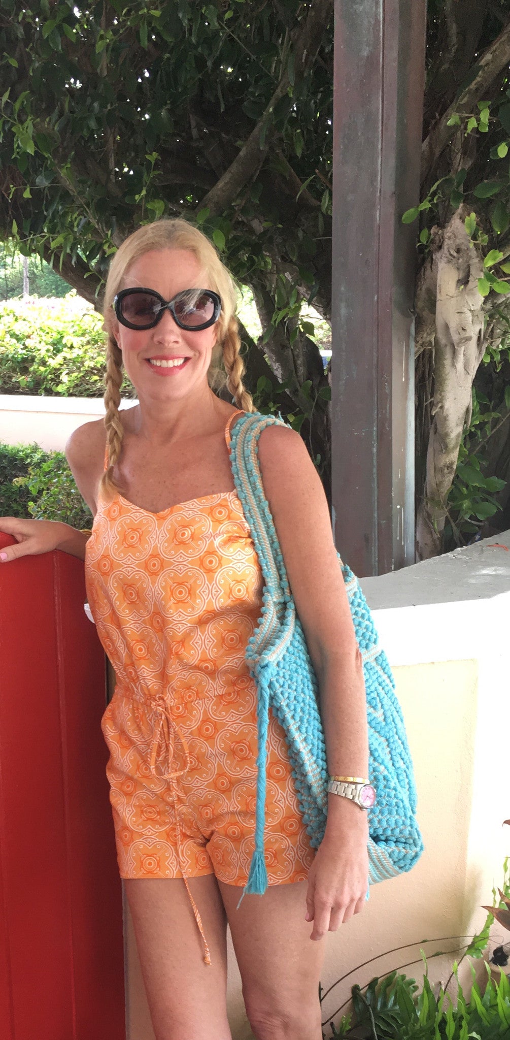 The Rosie Romper is shown in our JR Orange HICKS print and worn with the lavender Palm Beach tassel. Chose this romper for a football game, a picnic, evening dinner with wedges... or to lounge around the house watching Homeland.