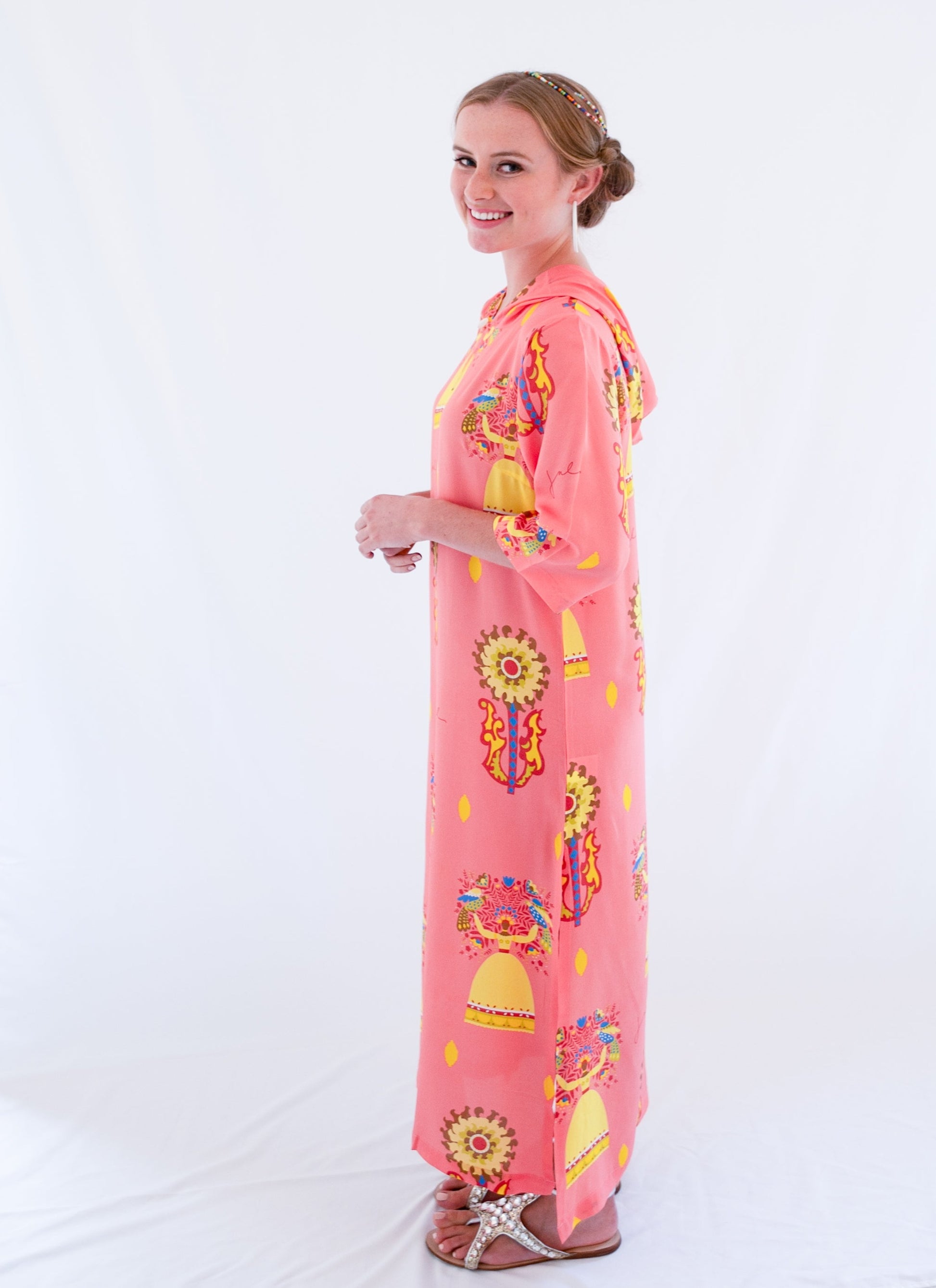 A great silk coverup for the pool or the beach. Made out of 100% Georgette Silk in the JR original print Spanish Lovers Pink. Side slits at both legs. Slips right over your head. 3/4 quarter sleeves. Wear open or button at the neckline. A hood adds a chic accent.
