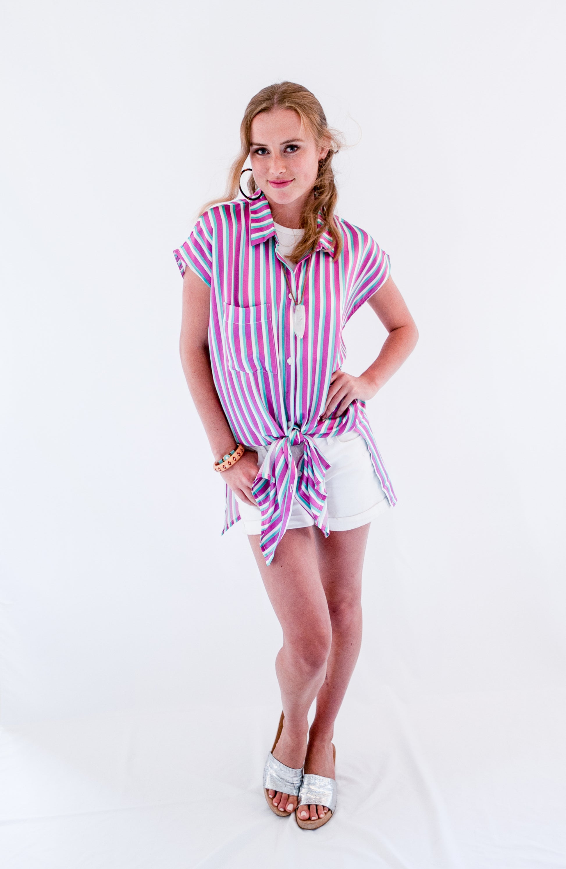 Buttons up the front with a collar, cap sleeves.