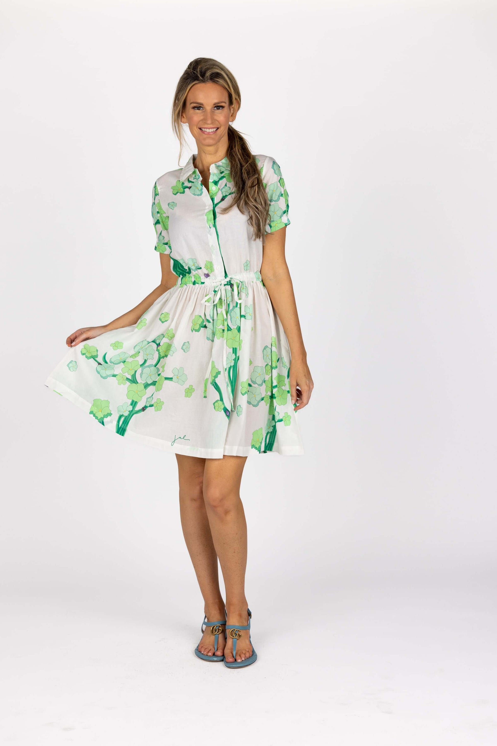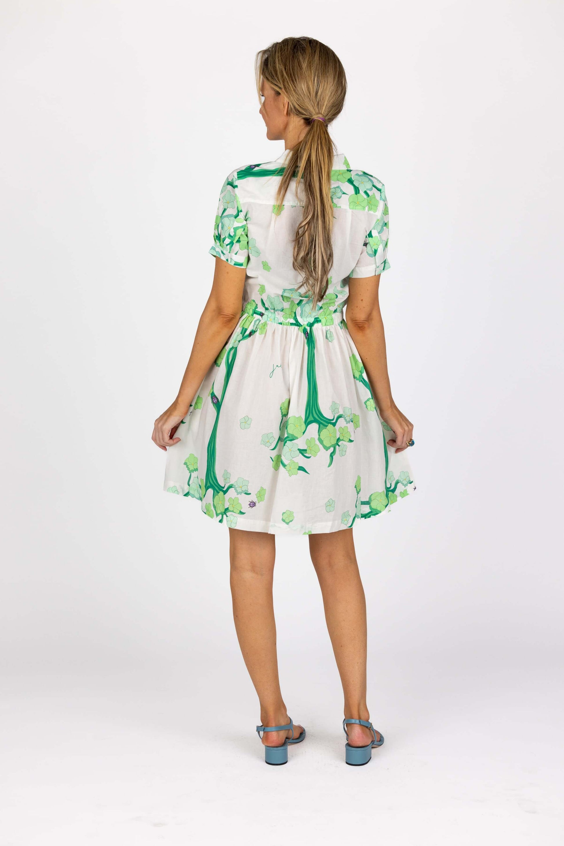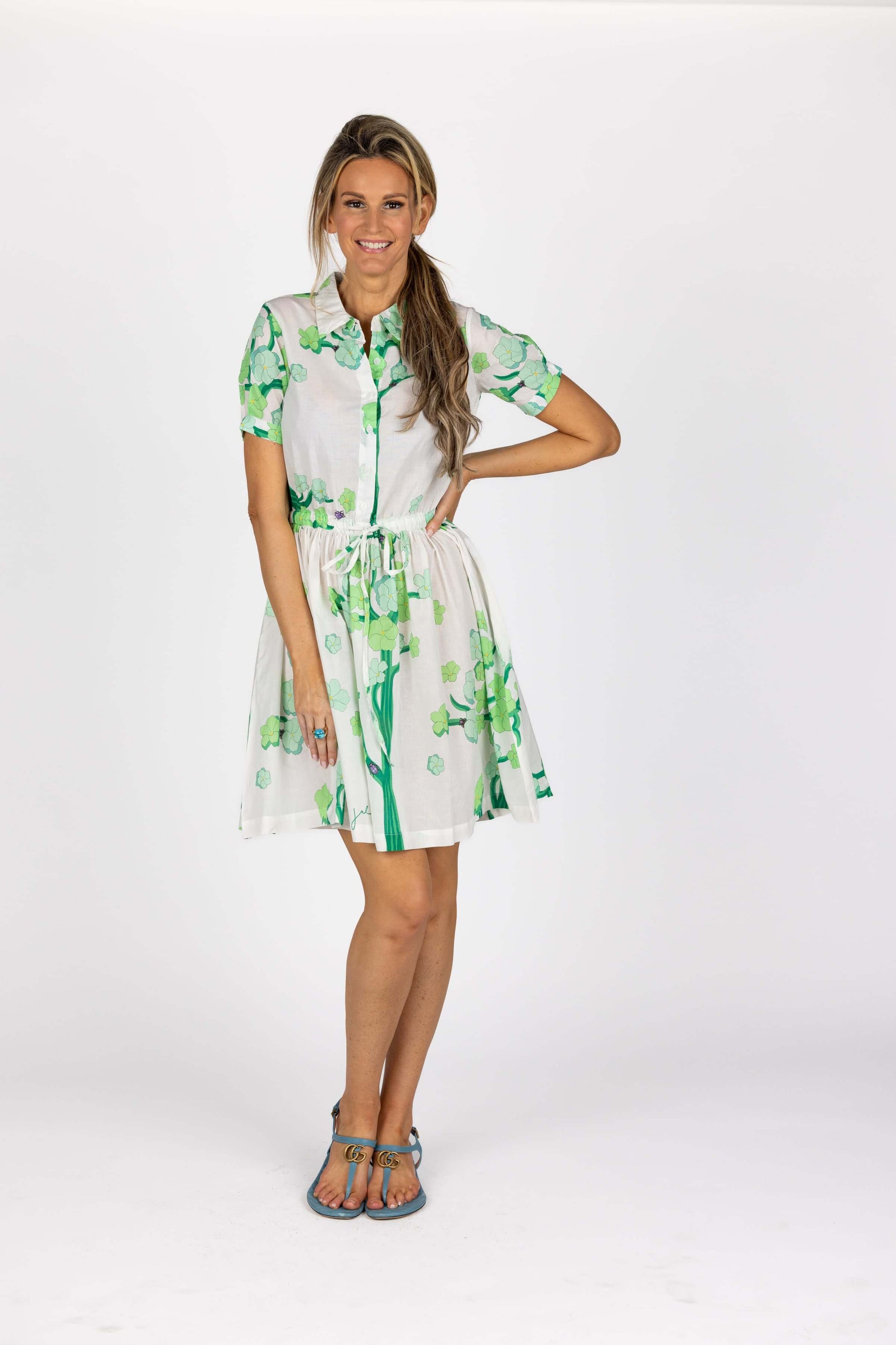 We think we have a new favorite. Comfty and feminine. A sort of swing dress to play or to entertain. Ties to adjust at the waist, and slips over your head. Roomy side pockets add a flare. Buttons up from the elastic waist.