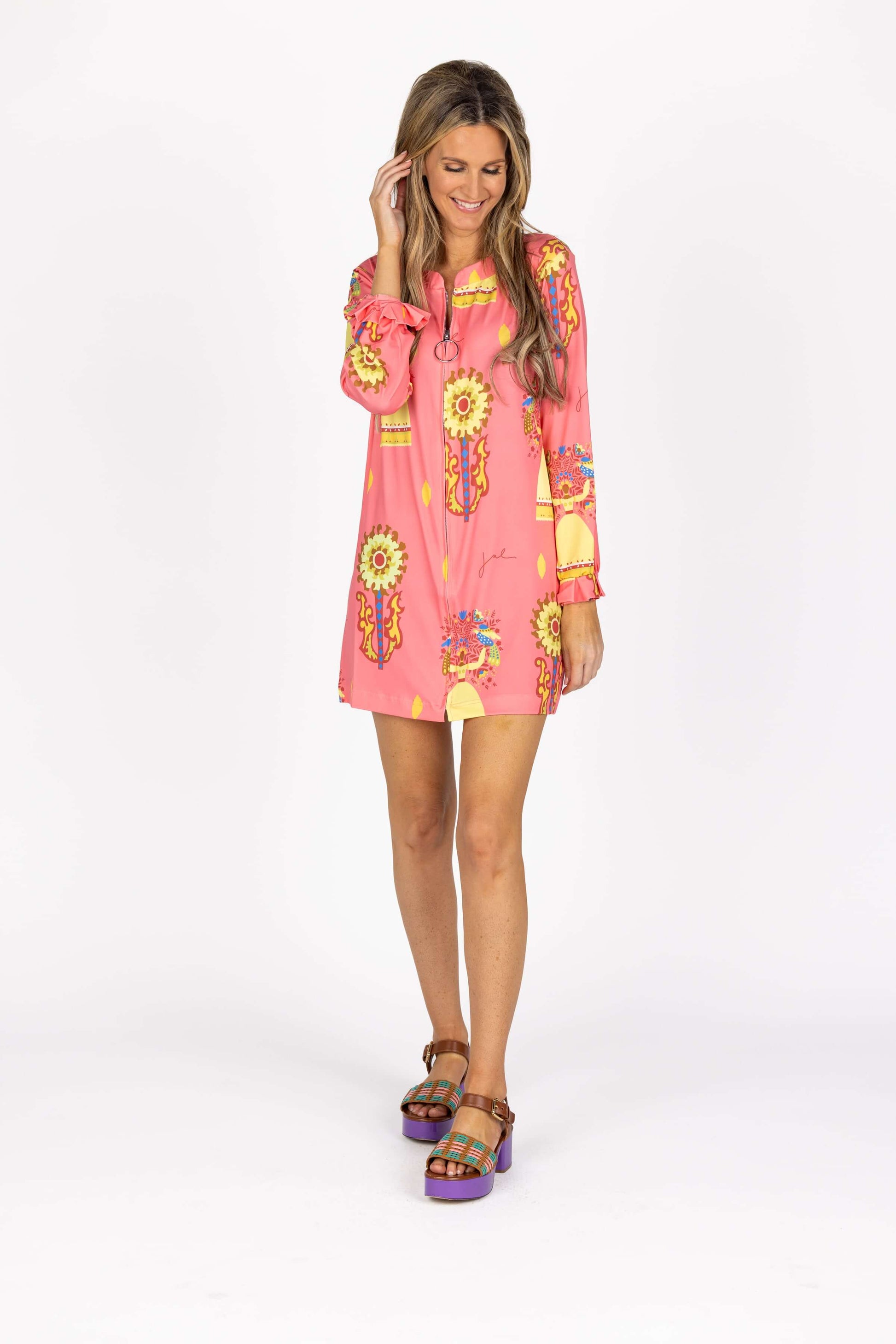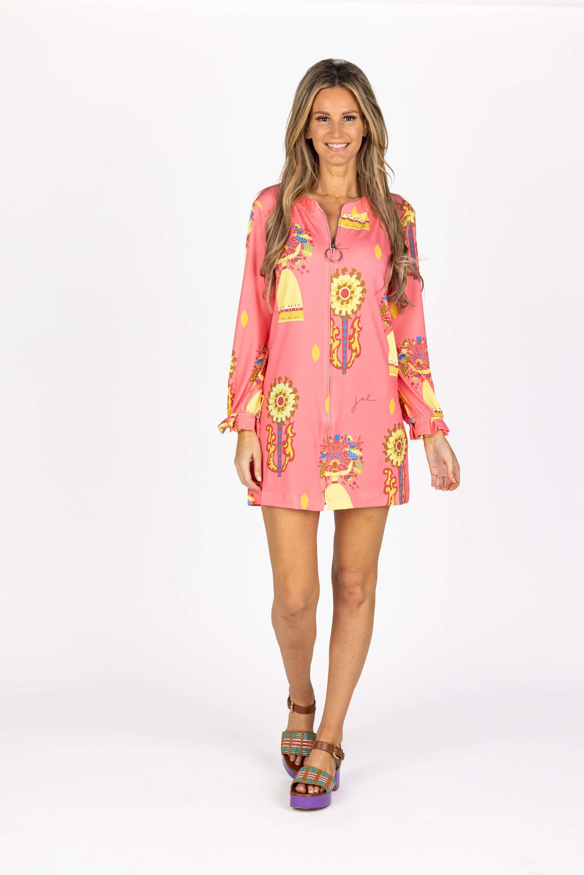 A dress coverup with a vintage vibe. An exposed Riri zips up the piece with a large circle silver pull. Pleated and flared at both wrists with a nod to Emilio Pucci. A tiny 2 inch mandarin collar adds the finsih. Made from a fully washable Spandex material. This fabric breathes and can folded up in your beach bag without a wrinkle.